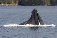 It's nearly noon by the time we get away the next morning. Out past Bella Bella and south down Lama Passage, retracing, for a few miles at least, our route northbound almost two months earlier. We turn right down Hunter Channel, departing from the classic 'Inside Passage'. At Soulsby Point we spot a lone humpback feeding - he puts on quite a display for us, and Cheryl gets some great photos. We head on down through Sans Peur Passage, into Cultus Sound, and then up into the McNaughton Group. There's some kind of floating fish camp in the 'Back Door Anchorage' (Douglass names), so we opt for 'Great Salt Lake Anchorage'